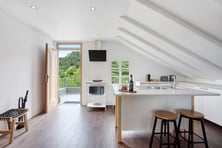 Fotografar este apartamento foi como respirar fundo. Inserido numa zona rural serena, este espaço enche-se de luz natural e transmite uma paz difícil de encontrar. A decoração neutra e contemporânea encaixa perfeitamente no ambiente campestre, criando uma sensação de leveza e conforto. Cada janela emoldura as vistas verdes como verdadeiras obras de arte.
